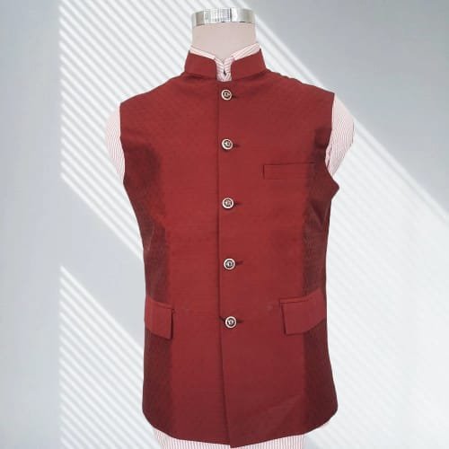 sleeveless jacket featuring a high, mandarin collar. The jacket is a deep, rich maroon or burgundy color. It has a smooth, slightly lustrous finish, suggesting a high-quality, possibly dressy, material. The front of the jacket features a row of round, dark buttons that match the fabric color, creating a cohesive and classic look. The vest is also designed with a small pocket on the chest and two larger pockets near the waist. It is displayed on a mannequin over a light-colored, possibly striped, shirt. Fabric: The fabric’s smooth and glossy appearance indicates it is likely a high-quality, structured material. Common